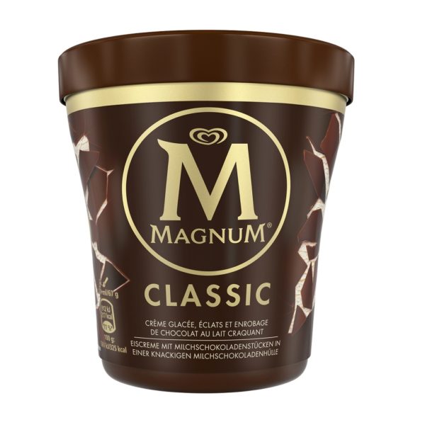 Pot de glace Magnum classique 440 ML composée de crème glacée, éclats et enrobage de chocolat au lait craquant.